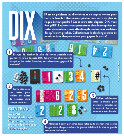 DIX est un jeu de stop ou encore et d’enchères passionnant pour toute la famille !